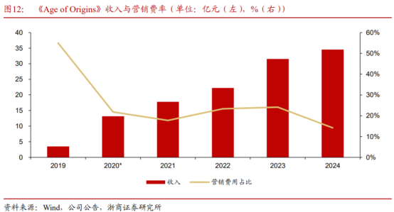 《Age of Origins》2019 年上线以来,年收入从约3.5亿元爬坡,第二年便达到了 13.2亿元,后逐年增加到 2024年的34.5亿元,且我们看到,其营销费用占(游戏业务收入,下同)比逐年降低,从2019年的55.0%降至2024年的14.2%,可见其后期利率润也在高速增长。