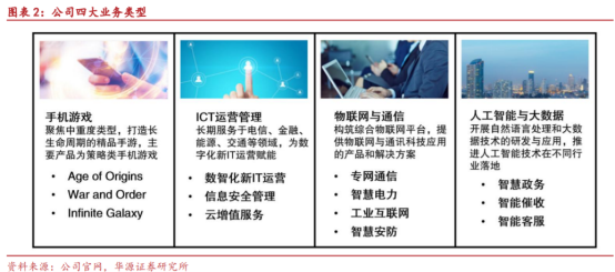 主营构成:游戏为基石,四大业务线齐发展。历经20余年的发展,公司构建了以通信和数据为核心的技术产品能力,形成了手机游戏、人工智能/大数据、物联网与通信、ICT运营管理四大业务板块。