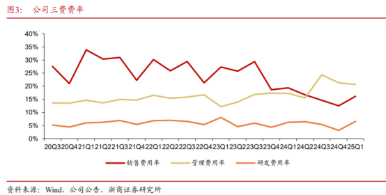 从成本端来看,公司近年来降本增效效果显著,整体费用率从21Q1的54.5%,降至25Q1的43.5%,其中:销售费用率下降显著;管理费用率有一定增长,24Q3达到高点后开始下降;研发费用率总体保持稳定。
