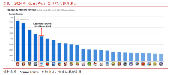 2024 年,《Last War》的收入迅速增长,从 2024 年 1 月的约 3000 万美元增至 2024 年12 月的约 1.38 亿美元,2025 年 1 月更是增长至 15 亿元,考虑到 SLG 游戏的生命周期通常为 6 至 8 年,增长趋势或将延续。