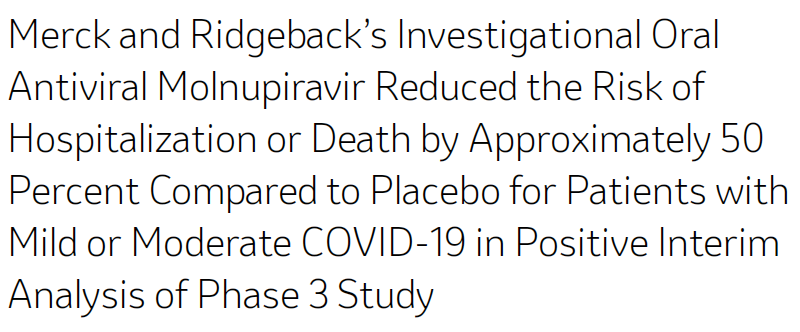 默沙东及其合作伙伴Ridgeback Biotherapeutics表示,早期结果表明,在新冠症状出现5天内服用这种名为molnupiravir的药物的患者,其住院率和死亡率大约是服用安慰剂的患者的一半。该研究以775名患有轻度至中度新冠肺炎的成年人为对象,由于存在肥胖、糖尿病或心脏病等健康问题,他们被认为患病风险更高。