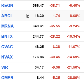 与此同时,美股抗疫概念股持续下挫,Vir Biotechnology跌超21%,诺瓦瓦克斯医药跌14%,Moderna跌9%,BioNTech SE跌6%,Vaxart跌10.57%,Inovio制药跌近8%。