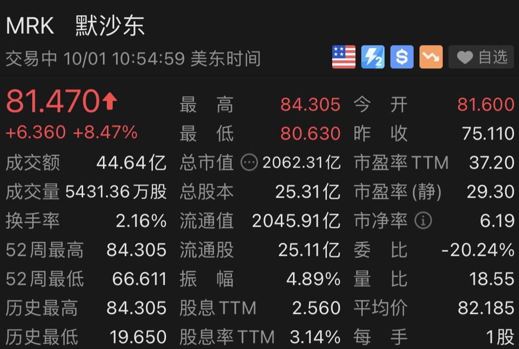 消息发布后,默沙东股价直线飙升,一度暴涨12%,截至发稿涨幅约8%。