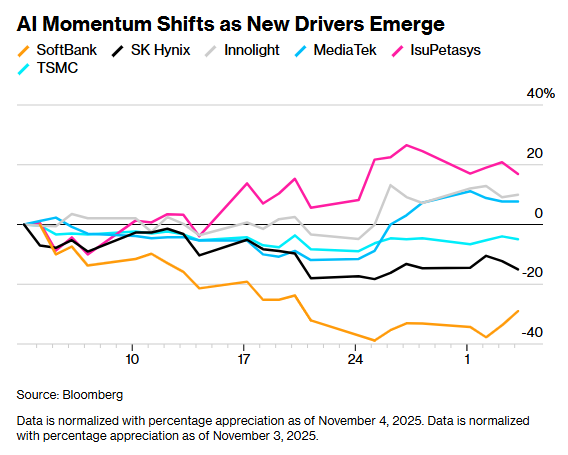 最新迹象显示,随着技术变革和泡沫担忧重塑着投资格局,投资者正积极寻找AI领域的新晋亚洲股票赢家,而那些昔日“王者”如今则似乎光芒黯淡了不少……