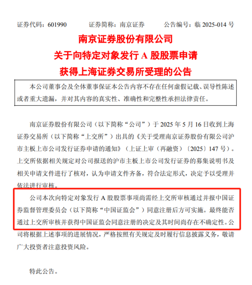 二是南京证券50亿元定增已于5月16日获得上交所正式受理。南京证券定增事项进度条拉动更受关注,主要是这距离公司2023年6月首次发布定增预案,已经过去了近两年时间。期间,南京证券定增经过修订,将原定50亿的募投方向从五个方向拆匀拆细至七个方向,提高对财富管理、信息技术、合规风控等方面的投入。