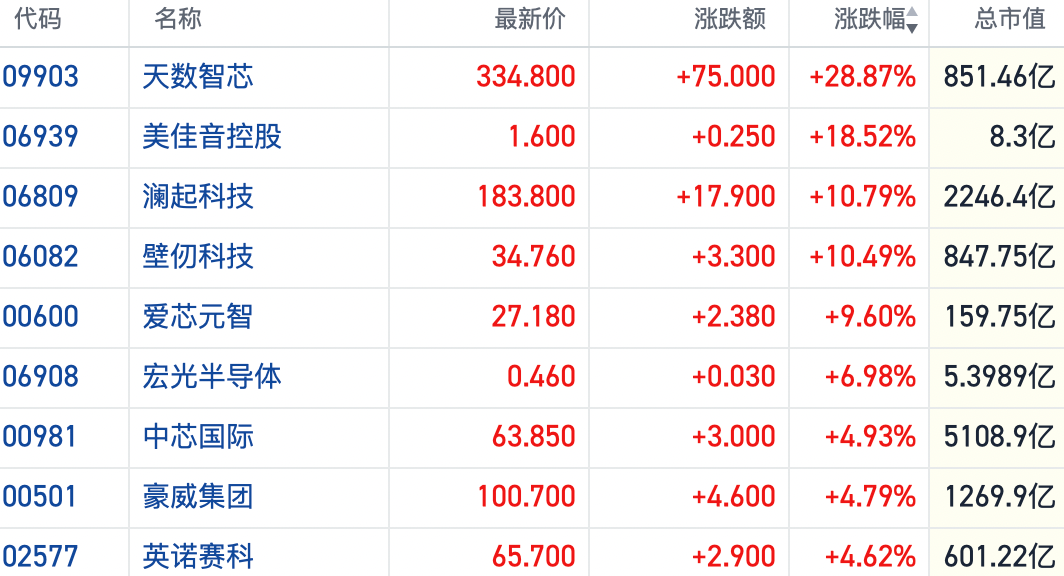 景气度高企!港股半导体板块再度走强 天数智芯大涨近30%