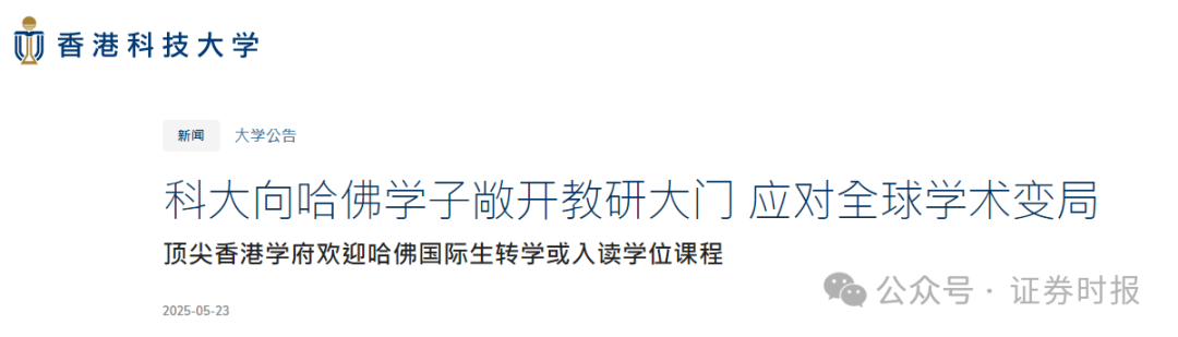 5月23日,香港科技大学(港科大)宣布,向现正就读哈佛大学的国际本科生及研究生,以及持有哈佛学位课程录取通知的学生,发出公开邀请,欢迎他们加入香港科技大学继续学业,延续学术追求。