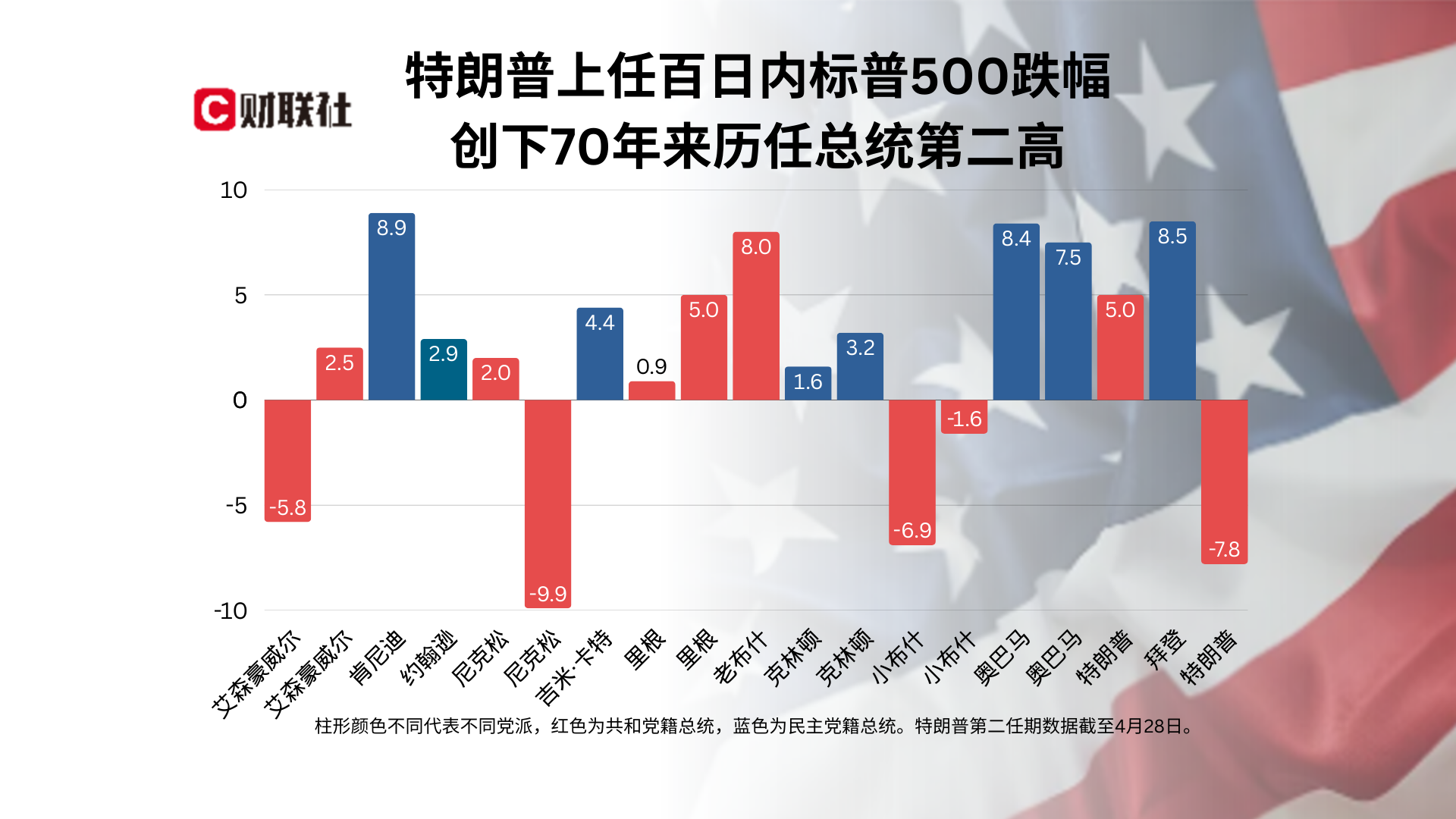 而特朗普上任100天内的标普500指数表现与其前任们相比也格外不同,而且是格外的糟糕,创下70多年来的第二差纪录,甚至不如他一直抨击的前总统拜登。