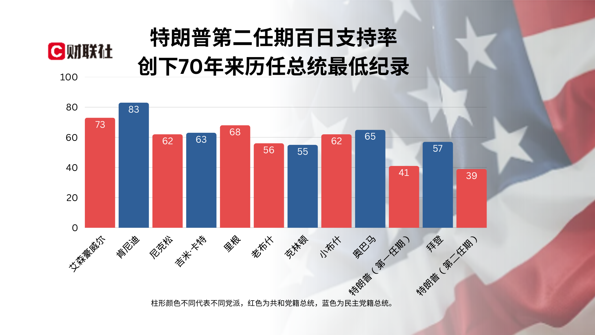 据益普索民调显示,特朗普百日执政表现的民众支持率仅达到39%,创下1953年以来历任总统的最低纪录,也刷新了他在2017年前一任期时创下的纪录。