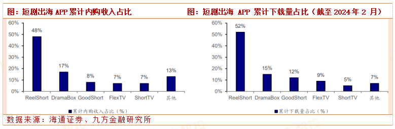 网文厂商开创短剧出海新方向,美国、东南亚为主要市场。援引 Sensor Tower 数据,截至 2024 年 2 月,已有 40 多款中国短剧应用进入海外市场,累计下载量 近 5500 万次,其中 ReelShort(中文在线旗下)贡献 52%的下载量,ShortTV 上线 6 个月累计下载量达 850 万次,以 15%的份额位列海外市场第二;累计内购收入达到 1.7 亿美元,其中 ReelShort 累计收入近 8000 万美元,占全球累计收入 48%。