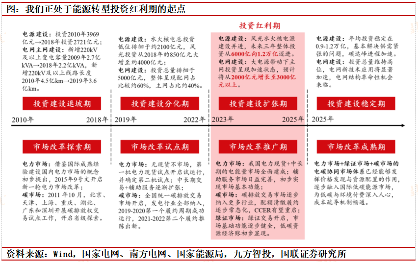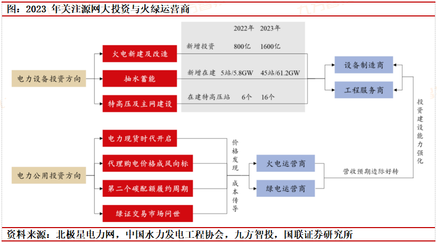 大型源网工程的投资体量将从2023年开始快速增长,包括火电新建及改造、抽水蓄能、特高压及主网建设等。经过21-22年研究论证与规划,行业迎来为期3年投资建设扩张期与市场改革推广期的起点。