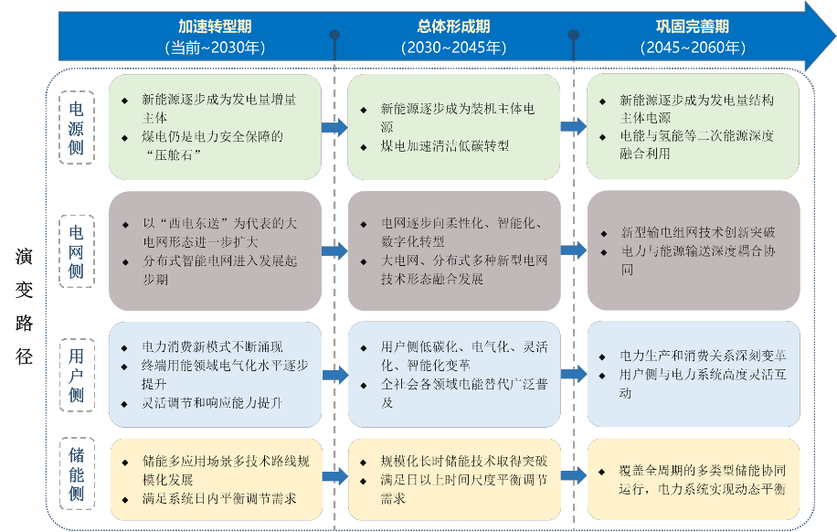 构建新型电力系统是一项复杂而艰巨的系统工程,不同发展阶段特征差异明显,需统筹谋划路径布局,科学部署、有序推进。按照党中央提出的新时代“两步走”战略安排要求,锚定2030年前实现碳达峰、2060年前实现碳中和的战略目标,以2030年、2045年、2060年为新型电力系统构建战略目标的重要时间节点,制定新型电力系统“三步走”发展路径,即加速转型期(当前至2030年)、总体形成期(2030年至2045年)、巩固完善期(2045年至2060年),有计划、分步骤推进新型电力系统建设的“进度条”。