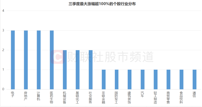 注:三季度最大涨幅超100%的个股行业分布(截至9月27日)