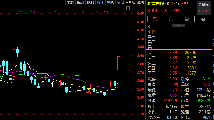 贵金属概念股早间集体上攻,板块指数放量高开高走涨逾2%。湖南白银开盘后不到2分钟时间就垂直涨停,白银有色、福达合金、中润资源等也纷纷直线拉涨停。