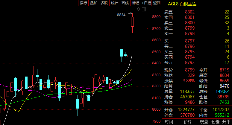 早间,国内白银期货主力合约大幅高开高走,连续突破8500元、8600元、8700元、8800元多道整数关口。截至午间收盘,最高涨逾4%,创上市交易以来历史新高。