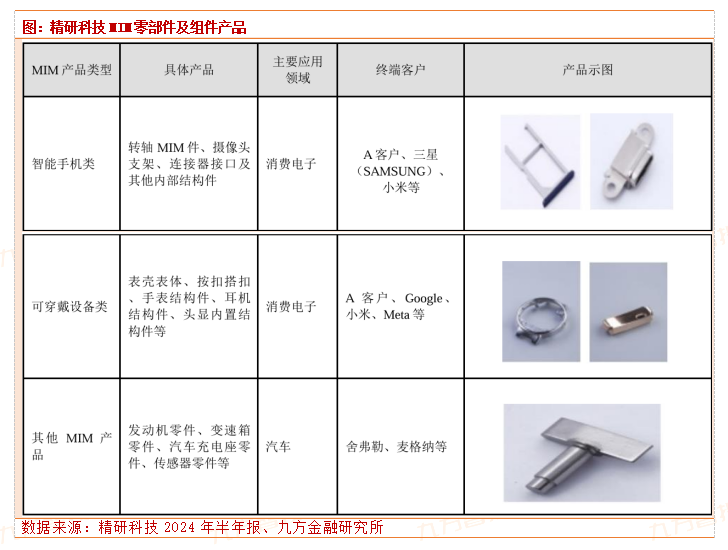 精研科技主要从事精密金属(包括 MIM,CNC,3D 打印等)零部件及组件,精密塑胶零部件及组件,传动及转动组件, 散热组件,智能制造服务,以及电子制造业务等六大业务板块,产品主要应用于消费电子、汽车、智能家居等行业。