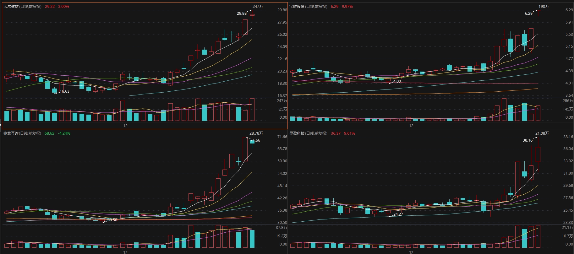 铜缆高速连接概念股持续活跃,公司产品SFP5650G高速线缆适用于高速通信场所的宝胜股份周五收盘录得7天4板,子公司400G、800G高速通信线为DAC铜电缆的沃尔核材周五收盘股价再创历史新高。有高速无源铜缆产品的兆龙互连周四收盘20CM涨停。