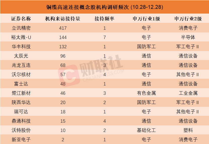 据Choice数据显示,10月28日至12月28日期间获机构调研的铜缆高速连接概念股包括:立讯精密、裕太微-U、华丰科技、太辰光、兆龙互连、沃尔核材、富士达、楚江新材、陕西华达、瑞可达、鼎通科技、沃特股份、新亚电子等,具体情况如下: