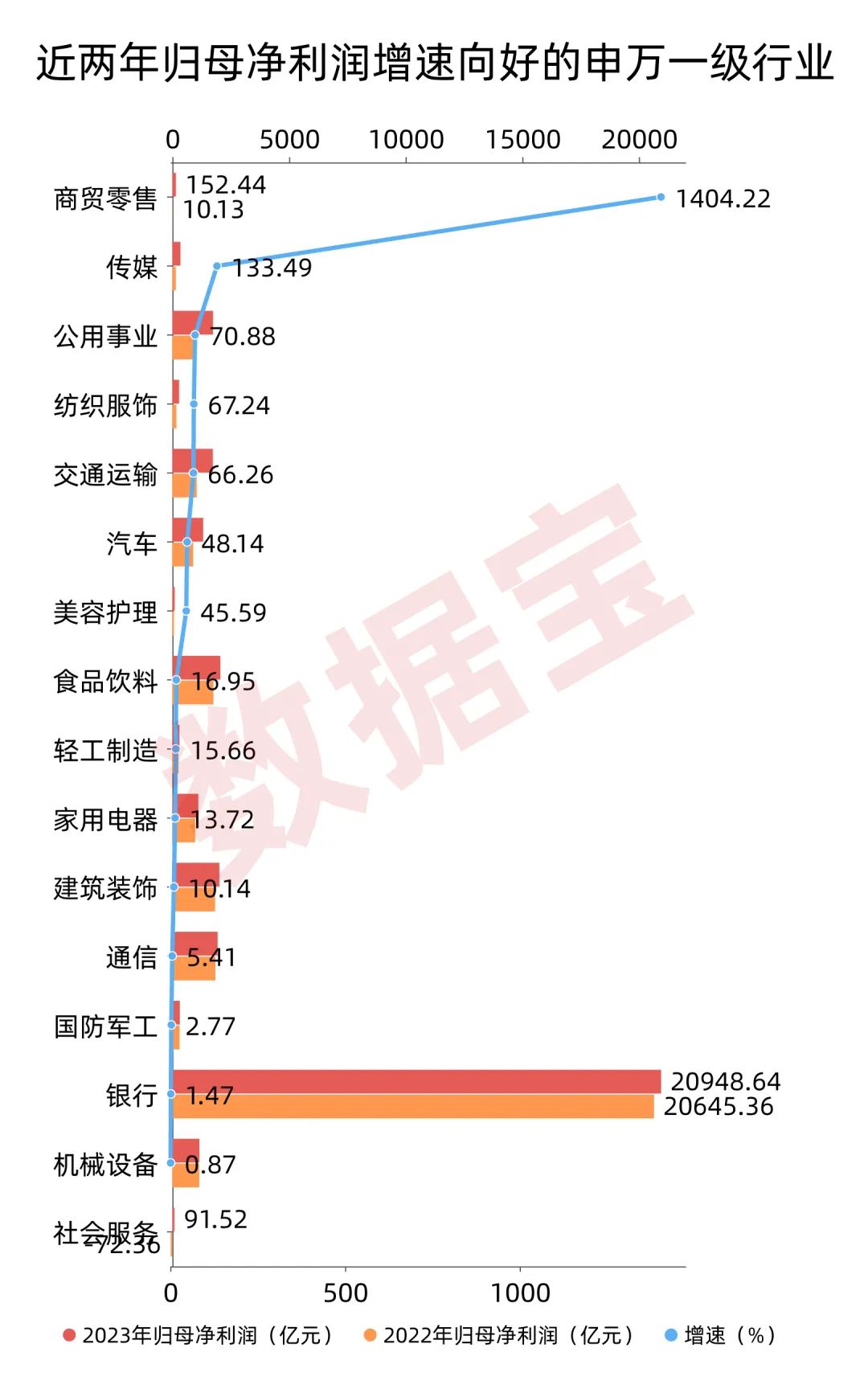 从净利润增长来看,11个行业2023年净利润增加超百亿元,公用事业、交通运输、汽车行业领跑,分别为723.79亿元、691.82亿元,429.59亿元。