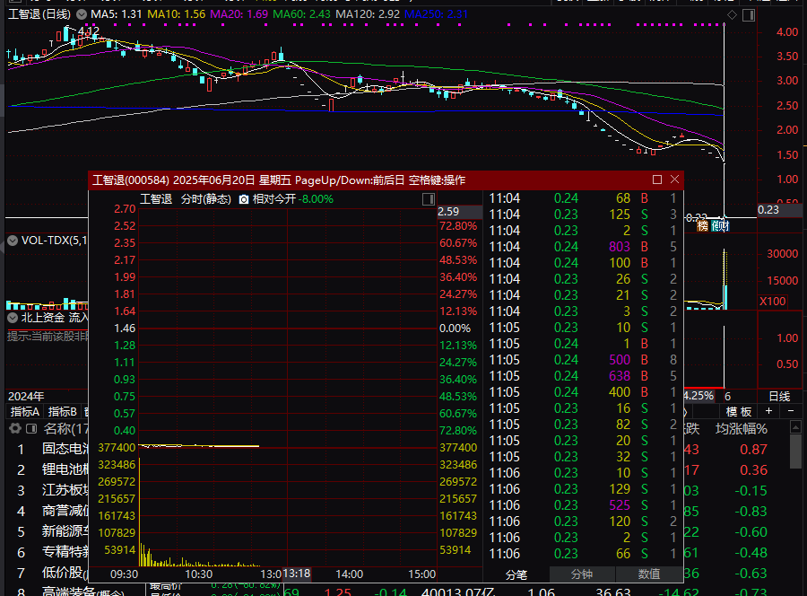 今天(6月20日)工智退(000584)进入退市整理期,上午盘中股价重挫,跌幅一度超过84%,与此同时成交量也急剧放大。
