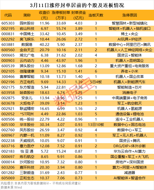 以封单金额计算,18股封单金额超1亿元,其中园林股份、岩山科技、中国稀土封单金额居前,分别为4.03亿元、3.89亿元、3.49亿元。