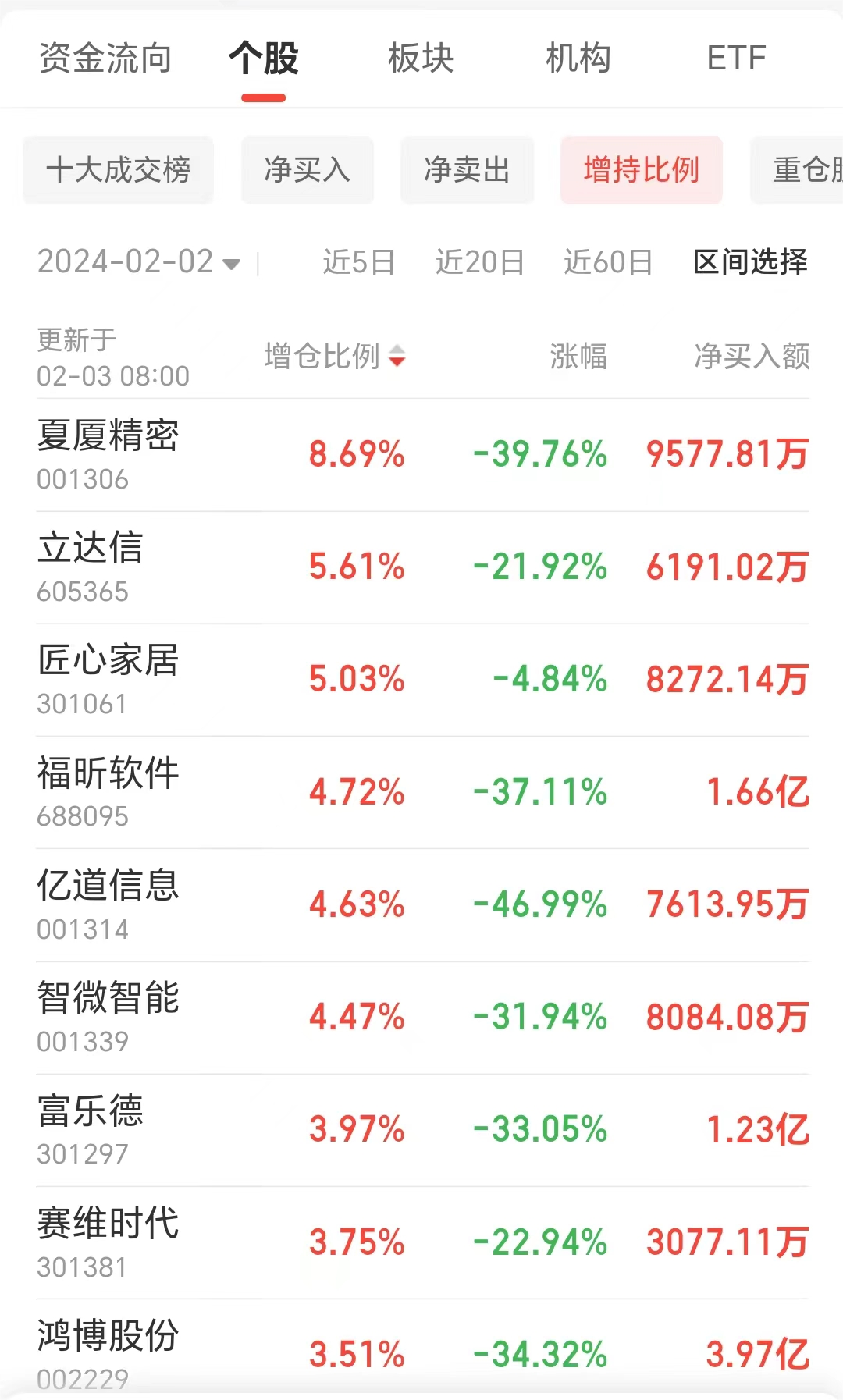 从增仓幅度看,据同花顺沪深港通数据,在1月2日至2月2日期间,获北向资金增持比例超过3.5%的A股上市公司包括夏厦精密、立达信、匠心家居、福昕软件、亿道信息、智微智能、富乐德、赛维时代、鸿博股份,具体情况见下表:
