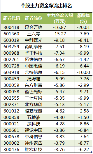 此外,3199只个股被主力资金净卖出,其中,144股被主力资金净卖出超1亿元。主力资金净流出最多的个股是昆仑万维,净流出金额为16.87亿元;主力资金净流出居前的个股还有三六零、中科曙光、药明康德、华工科技、拓维信息,净流出金额分别为15.27亿元、9.18亿元、7.51亿元、7.34亿元、6.67亿元。