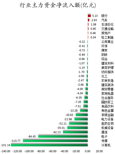 从行业板块来看,申万所属的31个一级行业,今日有6个行业板块主力资金呈现净流入,其中,银行行业板块主力资金净流入最多,净流入金额5.13亿元;行业板块主力资金净流入居前的还有汽车、石油石化,净流入金额分别为2.63亿元、1.08亿元。25个行业板块主力资金呈现净流出,其中,计算机行业板块主力资金净流出最多,净流出金额为131.14亿元;行业板块主力资金净流出靠前的还有传媒、电子、通信、机械设备、医药生物、电力设备,净流出金额分别为110.77亿元、84.45亿元、42.15亿元、35.01亿元、32.11亿元、22.96亿元。