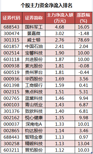 个股来看,今日有1768只个股获主力资金净流入,其中,20股获主力资金净流入超1亿元。国科军工获主力资金净流入最多,净流入金额为4.68亿元;主力资金净流入居前的个股还有景嘉微、威士顿、中国石油、宝馨科技、共进股份,净流入金额分别为3.02亿元、2.76亿元、2.41亿元、1.9亿元、1.87亿元。