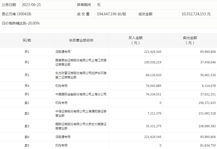 昆仑万维今天跌停。盘后数据显示,3个机构出现在龙虎榜单上,合计净卖出约2.08亿元;国泰君安证券股份有限公司上海江苏路证券营业部买入1亿元,同时卖出3745.86万元;中信证券股份有限公司上海溧阳路证券营业部买入721.14万元,同时卖出1.52亿元。