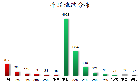 截至收盘,沪深两市合计817只个股上涨,4079只个股下跌,平盘个股92只,停牌的个股27只。不含当日上市新股,共有46只个股涨停,21只个股跌停。连续涨停天数看,*ST美谷均已连收4个涨停板,连续涨停板数量最多。