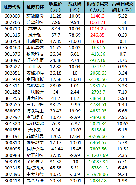 盘后龙虎榜数据显示,今日机构席位资金合计净卖出约14.11亿元。其中,净买入的个股5只,净卖出的个股22只。机构净买入最多的股票是豪能股份,净买入金额约1140.2万元;机构净买入居前的还有蓝黛科技、苏美达等股。机构净卖出最多的股票是昆仑万维,净卖出金额约2.08亿元;机构净卖出居前的还有中大力德、焦点科技、金桥信息、华工科技、福昕软件等股。