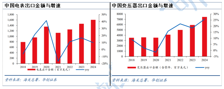 以变压器、电表出口为例,根据海关总署,2024年中国电表、变压器(含零件)出口金额分别为16.06、74.44亿美元,其中对美国出口分别为2.72、732.07百万美元,占比分别为0.17%、9.83%,国内电表、变压器出口增长良好的同时,对美出口占比低、美国关税风险敞口小(尤其A股上市公司对美出口少)。