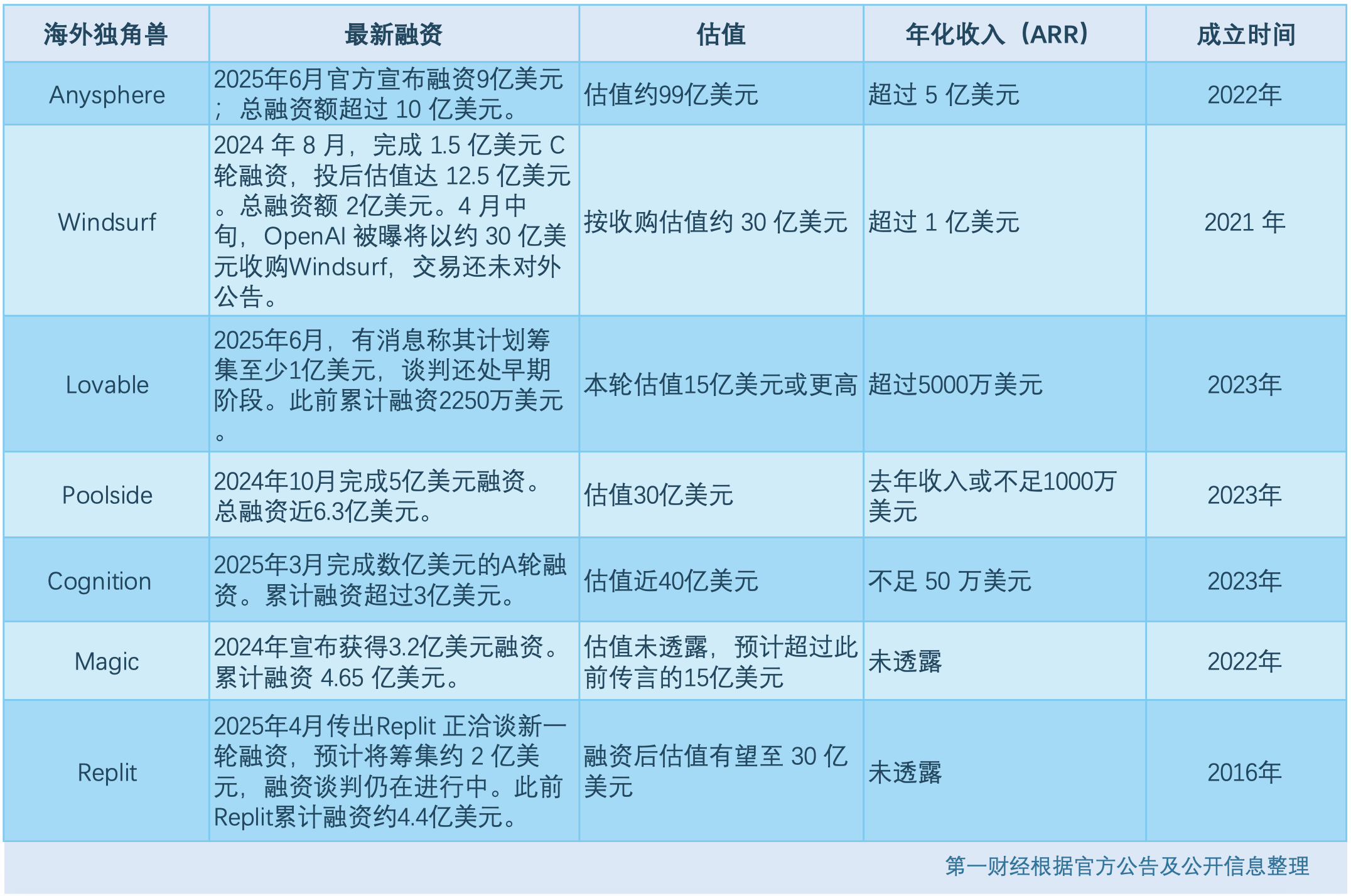 据第一财经不完全统计,以Anysphere为首,在海外,估值超过10亿美元的AI编程独角兽至少已有7家,总融资额近34亿美元(人民币超过240亿元)。