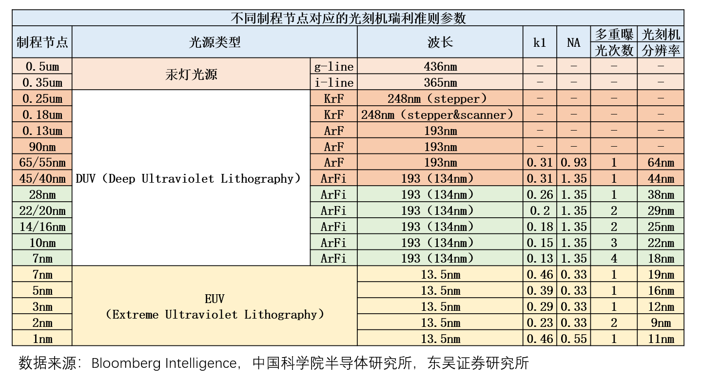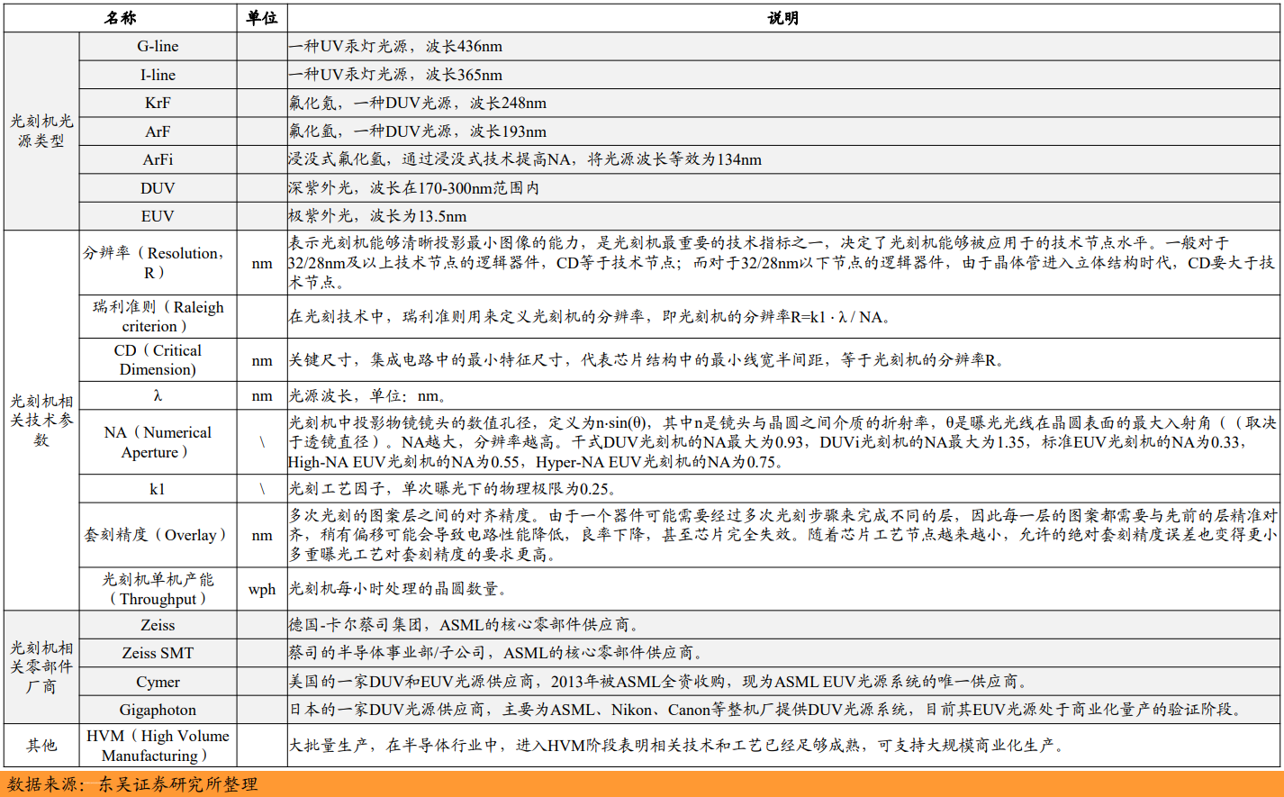 光源&数值孔径&工艺因子三轮驱动,共促光刻技术迭代。光刻机在光刻工艺中承担曝光这一核心步骤,投影式掩模光刻长期成为IC光刻机采用的主流技术。投影式光刻机可按曝光方式分为扫描式、步进重复式和步进扫描式(目前步进扫描式为行业主流),也可按光源类型分为UV、DUV和EUV光刻机。过去40年光刻机的技术迭代主要围绕分辨率、套刻精度、产能三大关键指标以及决定分辨率的光源波长、数值孔径和工艺因子三大参数展开。