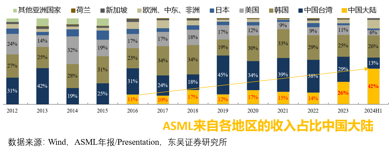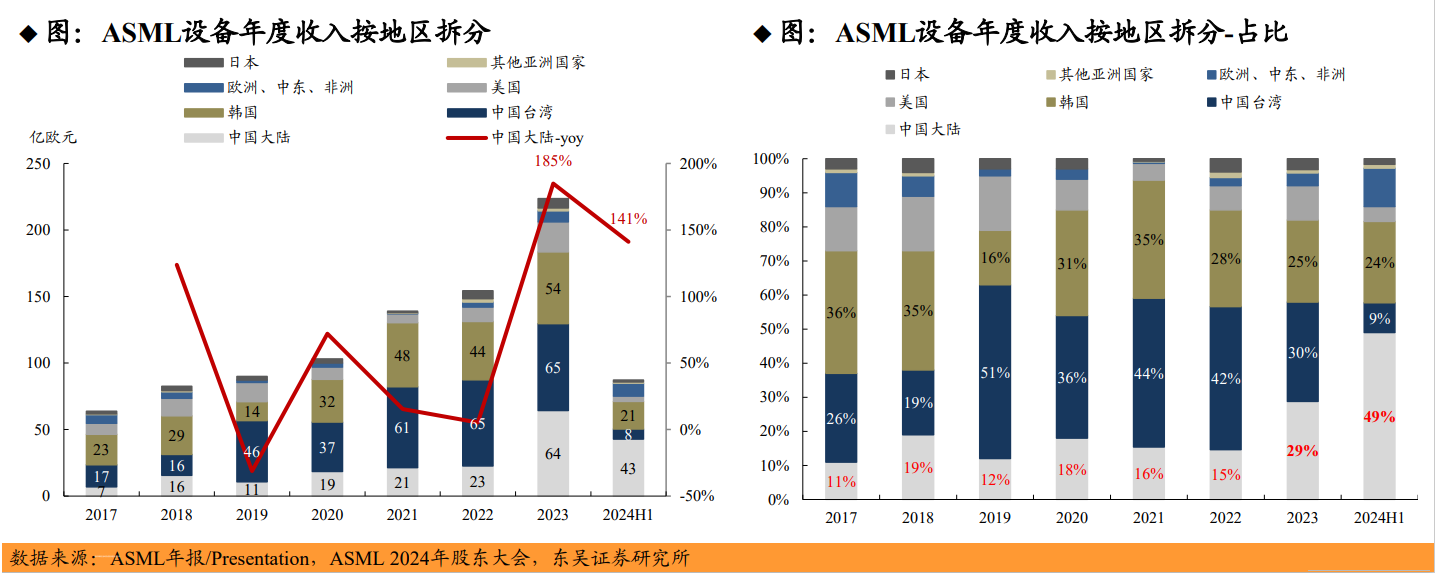 2023年以来ASML来自中国大陆的营收快速增长,营收占比大幅提升。24H1ASML来自中国大陆的营收同比高增,占比同比+15pct达到42%。