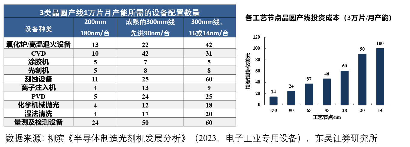 一超双强格局稳定,晶圆扩产拉动需求增长。2023年全球IC光刻机市场规模接近260亿美元,且稳定呈现“一超双强”的竞争格局,其中ASML在DUV和EUV光刻机市场均占据主导地位,特别是EUV光刻机市占率达到100%。展望未来光刻机市场需求,ASML预计2025年、2030年全球晶圆需求将分别达1280万片/月、1660万片/月(等效12英寸),2020-2030年成熟制程和先进制程晶圆需求CAGR分别为6%和10%,从而带动光刻机特别是中高端光刻机的需求增长。
