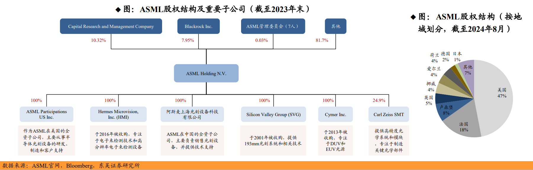 ASML的股权较为分散,公司前几大股东均为欧美机构投资者。截至2023年末,公司前两大股东分别为美国资本研究与管理公司(持股10.32%)和贝莱德(持股7.95%)。7名核心高管仅持有0.03%的公司股份。截至2024年8月,美国地区的投资者合计持有ASML47%的股份。
