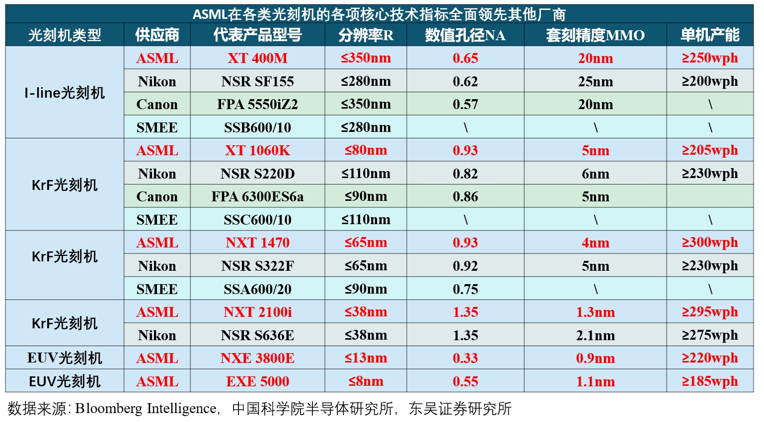 (1)技术:ASML早期凭借PAS5500、双工件台、浸没式、EUV四项技术实现赶超日本,如今ASML各项光刻机指标均在引领行业,成为延续摩尔定律的先锋。