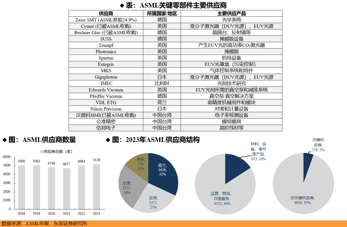 2023年末,ASML拥有约5100家供应商,其中约800家供应商提供直接用于生产公司产品的材料、设备、零件等,占公司采购总额的 69%,800家产品相关供应商中约280家是关键供应商,约占产品相关支出的94%。另有4300供应商提供 产品运营、物流、IT等服务。从地域分布来看,ASML的供应商主要来自荷兰、亚洲和北美,在数量上分别占到供应商总数的32%、27%、 26%。