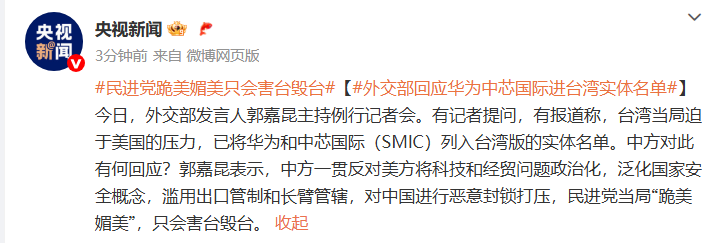 有记者提问,有报道称,台湾当局迫于美国的压力,已将华为和中芯国际(SMIC)列入台湾版的实体名单。中方对此有何回应?