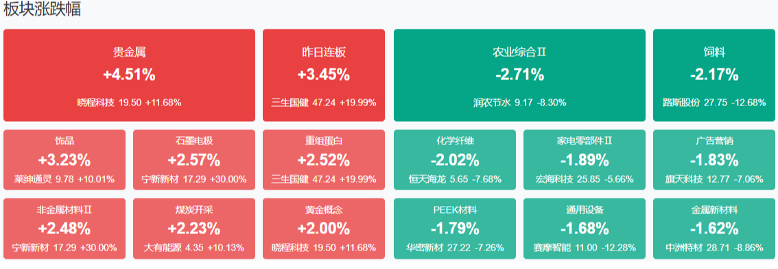 板块方面,黄金、固态电池、创新药、煤炭等板块涨幅居前,化学纤维、PEEK材料、AI语料、可控核聚变等板块跌幅居前。截至收盘,沪指涨0.21%,深成指涨0.44%,创业板指涨0.83%。