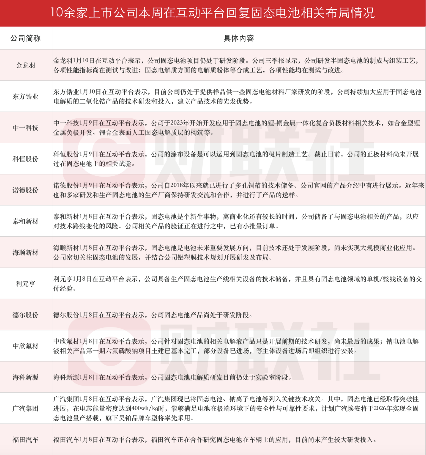 据财联社不完全统计,本周包括金龙羽、东方锆业、中一科技、科恒股份、诺德股份、泰和新材、海顺新材、利元亨、德尔股份、中欣氟材、海科新源、广汽集团及福田汽车等多家上市公司在互动平台回复固态电池相关布局情况,具体情况如下表:
