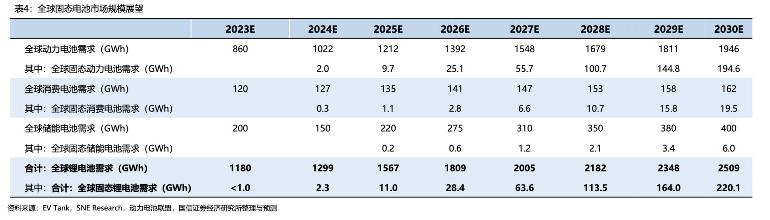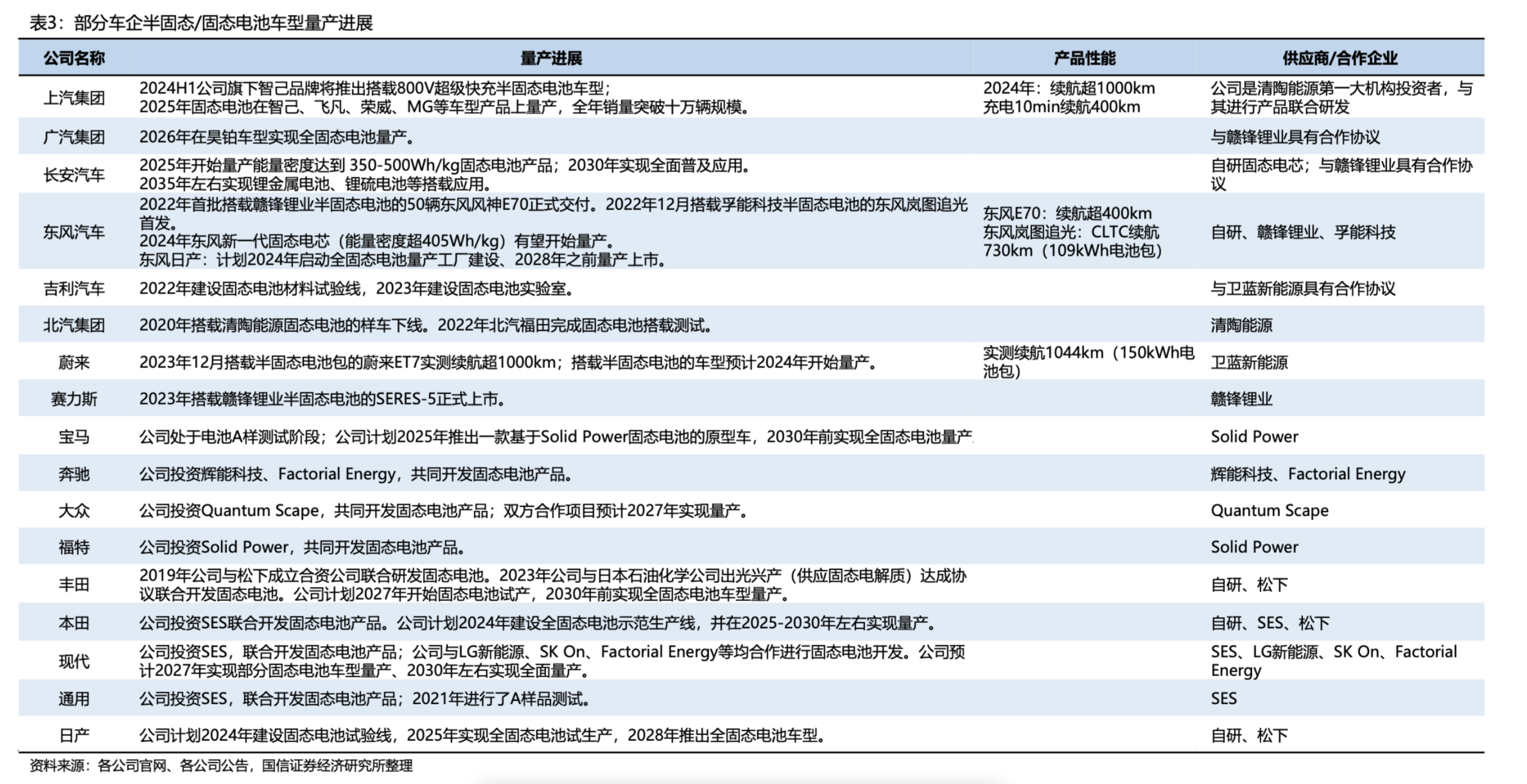 国信证券王蔚祺预计,2024年部分电动车或将开始小批量使用半固态电池,国内的上汽、蔚来有望在2024年批量生产半固态电池车型,长安、广汽等也计划在2025-2026年推出半固态电池车型。