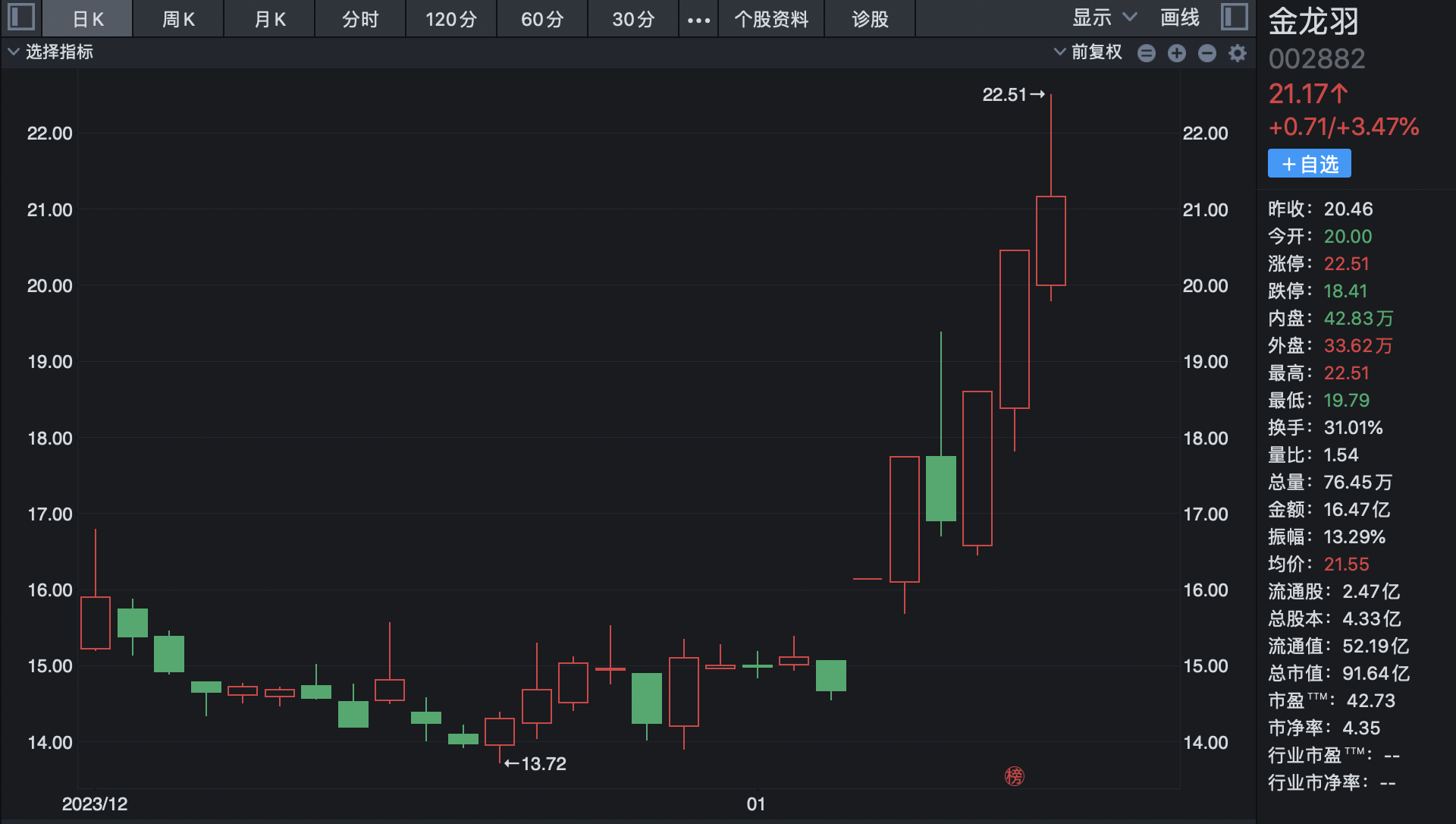实际上,早在去年年初金龙羽就曾因沾上固态电池概念而被爆炒,在2月7日至2月14日期间录得6天5板,股价创22.59元/股的历史新高。目前来看,公司在此番热炒下周五盘中股价一度上涨至21.17元/股,已十分接近此前高点。