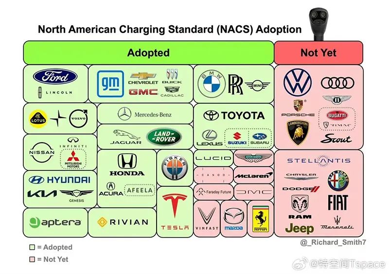 有海外网友统计了目前北美所有宣布采用和未采用NACS充电协议的汽车制造商,规模化优势一目了然。