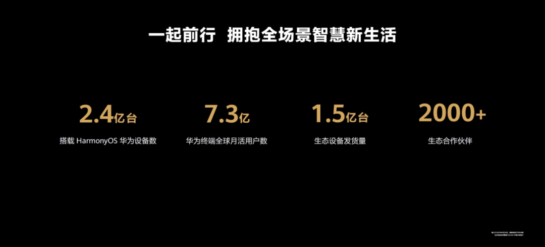 余承东表示,截至目前,搭载HarmonyOS的华为设备数超过2.4亿台、生态设备发货量超过1.5亿台,华为终端全球月活用户数7.3亿,生态合作伙伴超过2000家。