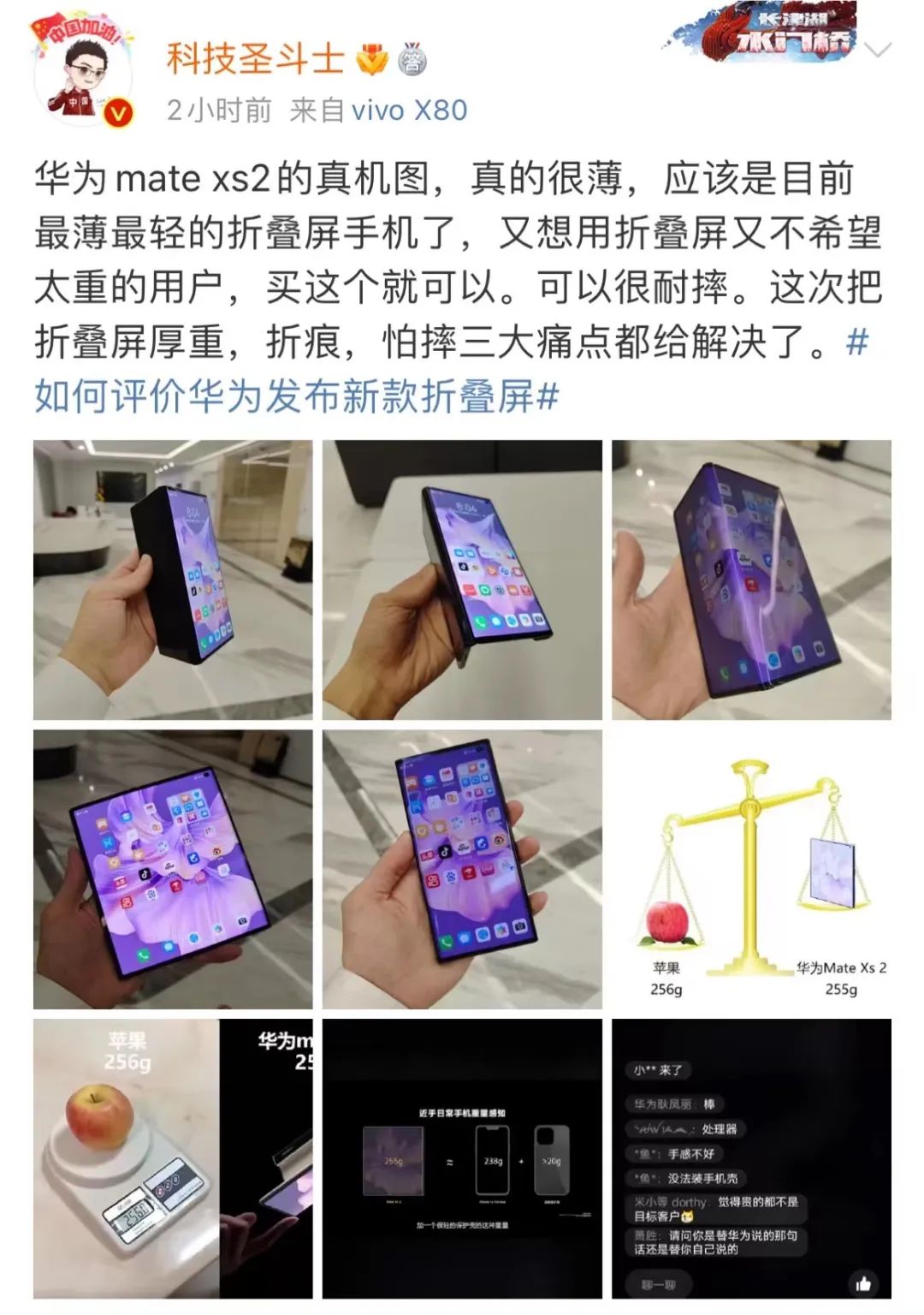 值得一提的是,华为新折叠屏手机MateXs2,仅重255g,是目前业界最轻的折叠大屏手机。据微博数码大V测评,甚至比256g的苹果还轻。