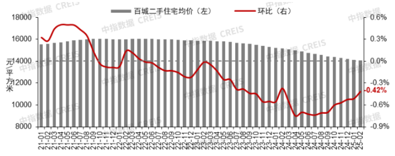 根据中国房地产指数系统百城价格指数,2025年2月,百城二手住宅均价环比下跌0.42%,跌幅收窄0.1个百分点,同比下跌7.26%;十大城市二手住宅均价环比下跌0.25%,同比下跌6.32%。