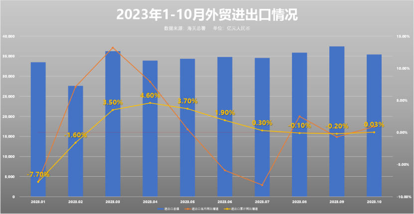 具体到10月份来看,进出口总值为3.54万亿元,同比上涨0.9%。其中,出口总值为1.97万亿元,同比下降3.1%;进口总值为1.57万亿元,同比上涨6.4%。